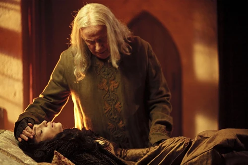 Gaius is flabbergasted when he learns that Merlin has agreed to heal a druid boy's sister in the valley of the fallen kings. The place is a breeding ground for cutthroats and bandits and many who venture there never return. Gaius is also unsure what to tell if he is questioned about Merlin's absence. When Arthur comes looking for his servant Gaius claims he has sent Merlin in search of a rare plant. Later that day Gaius grudgingly has to help the king to get dressed and advises him to watch his back with King Sarrum as the man is known for betraying his allies. The physician understands that Arthur is curious about how Sarrum managed to capture and contain Morgana but again advises caution.When Merlin doesn't return as planned Gaius ask Arthur to send out a search party to locate his ward. Guinevere blocks this attempt by claiming that Merlin confided in her that he has a sweetheart somewhere in the country and that he must be with her now. After Daegal's burial Gaius agrees that Guinevere has been enchanted somehow by Morgana and that they must reverse it.