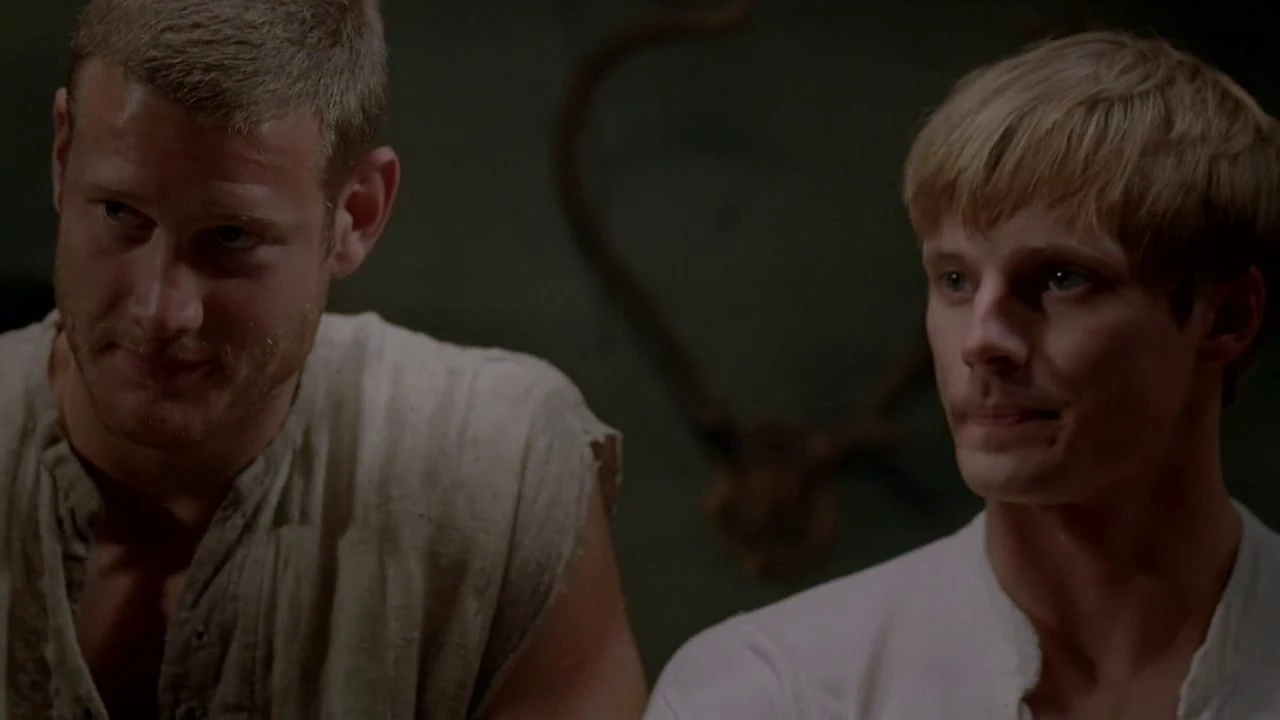 Gwaine and Percival stealing a roast chicken from the castle kitchens.
